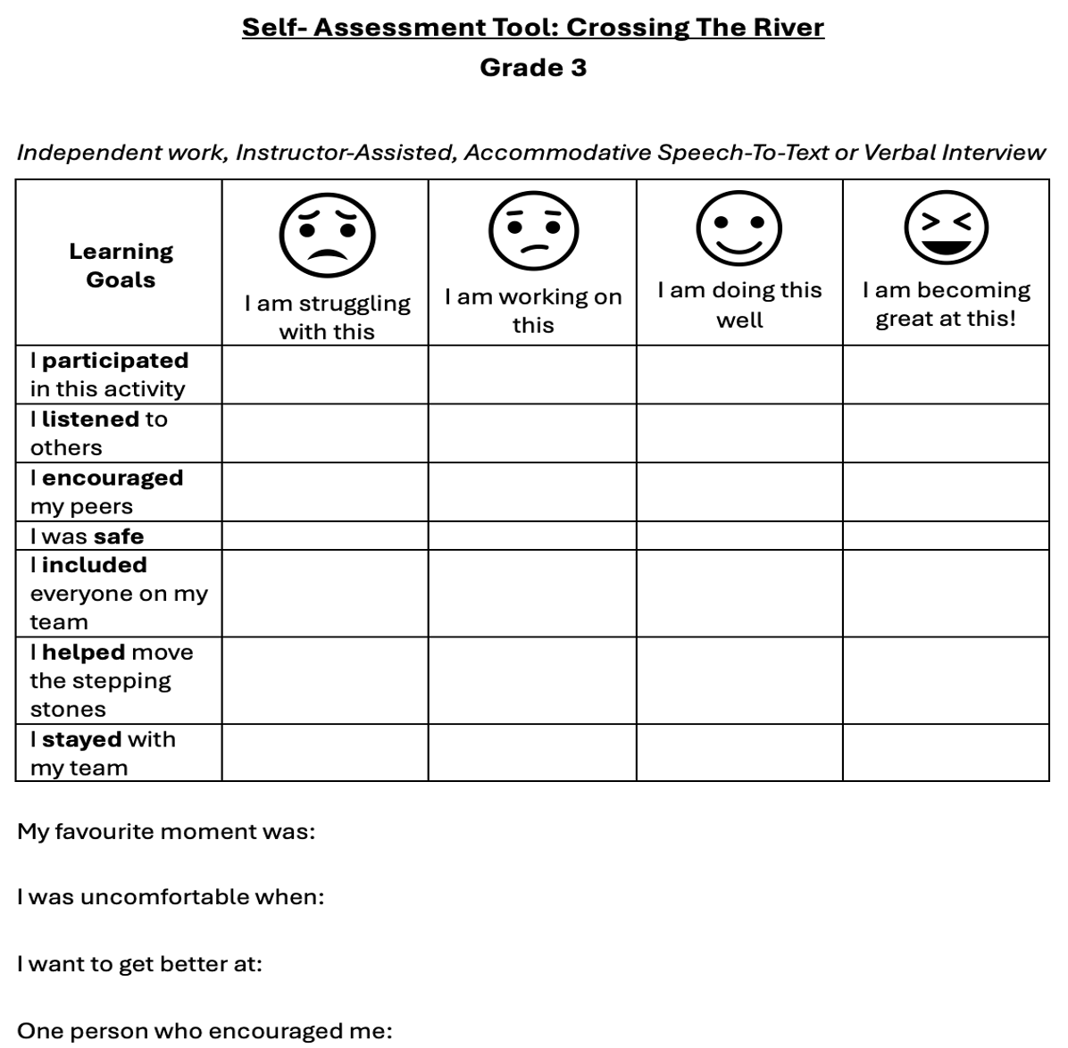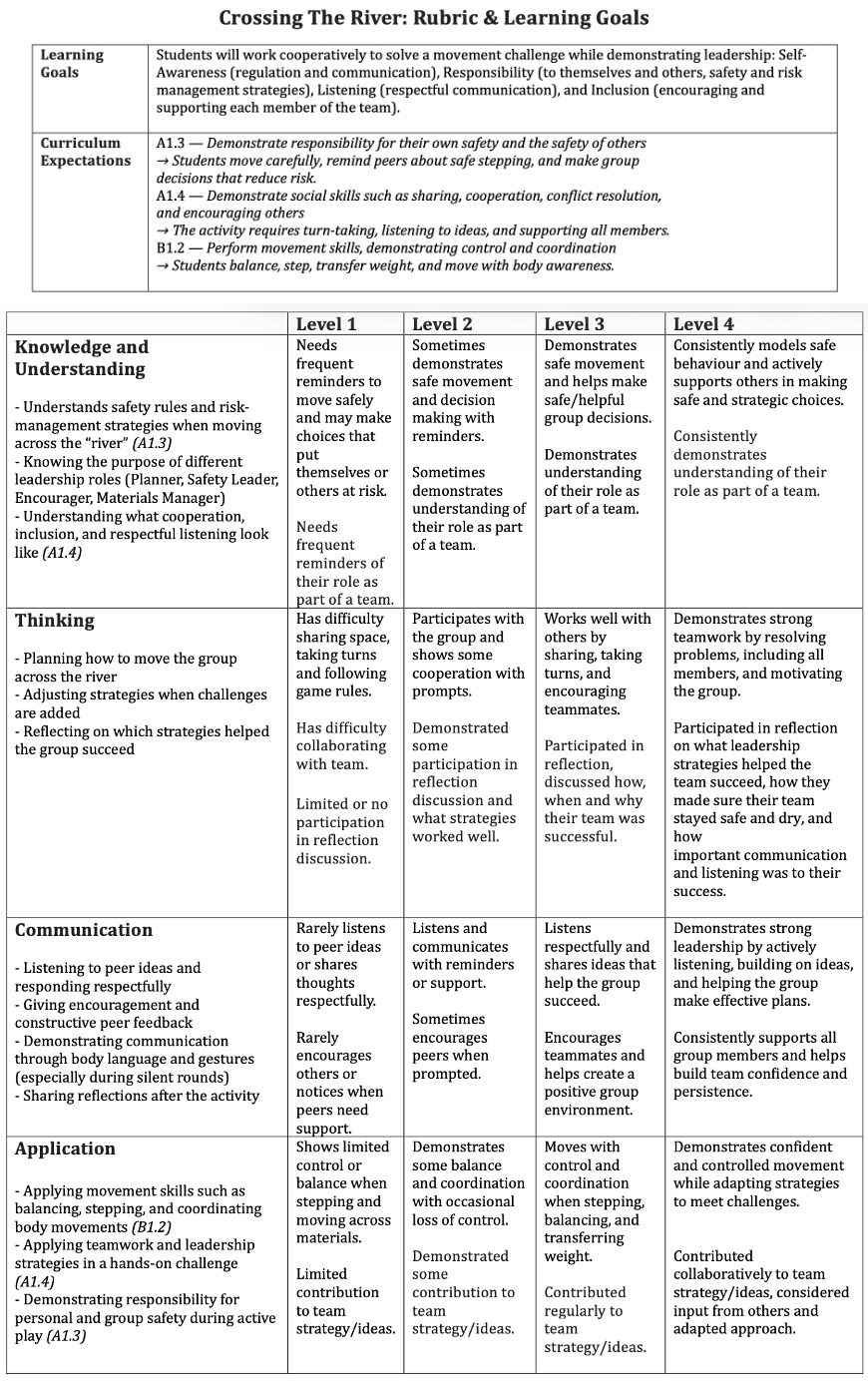 Various essential assessment strategies for outdoor education support both student learning and engagement. Debriefing is used to deepen learning and help transition or scaffold between activities by providing clear, concise instructions beforehand. This includes breaking tasks into manageable steps, and bringing closure afterward by encouraging students to reflect on how their experiences may impact the future or guide their next steps in learning. When used with intention, praise can play an important role in providing Constructive Feedback in the classroom. Praise models for students what positive interaction and collaboration look like, when working toward a shared learning goal. Thoughtful praise also allows all learners to feel seen and heard, which can contribute to a more inclusive and supportive learning environment - when students are recognized for specific efforts, it can help to build their self-esteem and accountability. Learner-led Evaluation highlights the importance of student voice, allowing learners to actively engage in their learning journey while providing valuable insight for educators. Triangulation of Data supports assessment by using various strategies related to observations, conversations, and products to gather ongoing evidence of learning without interrupting the experience. Summative Rubrics rely on an understanding of the four categories of assessment (KUTCA) with the recognition that level 4 achievements should be attainable for all learners.