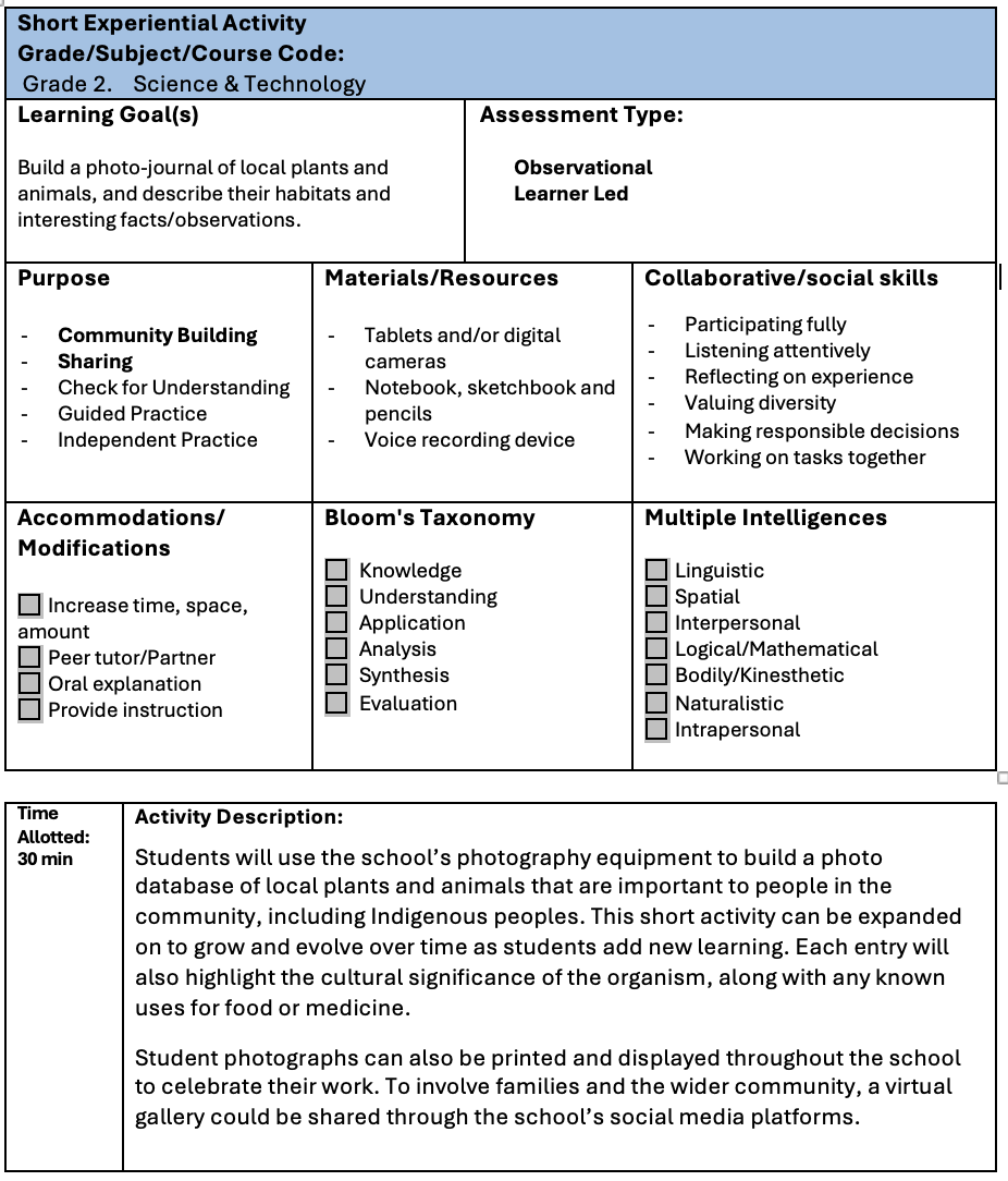 Short experiential activities are an effective way to keep learners engaged, assess their prior knowledge, and foster a sense of collaboration within the group. Learning through authentic experiences plays an important role in developing deeper understanding, strengthening skill development, and increasing student motivation. Experiential activities encourage critical thinking, resilience, and adaptability while actively involving students in their learning. Providing opportunities for experiential learning also supports a more holistic education, allowing students to apply what they know in meaningful, real-life contexts. These kinds of activities let students have the opportunity to develop important skills such as critical thinking, problem solving, imagination and creativity, and connect them to the real world they are embedded in.