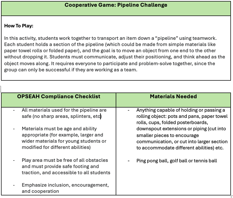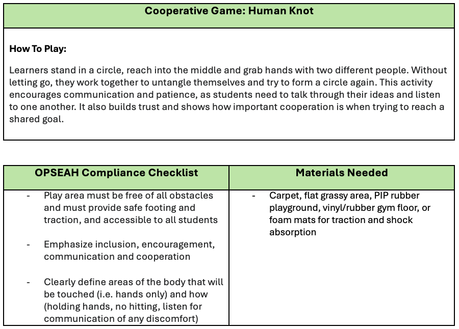 Cooperative games help build teamwork, communication, and trust among students while teaching them how to work together instead of competing against one another. They emphasize participation, inclusion, and shared success; creating an environment where all students can feel valued and supported. Cooperative games also help students develop a sense of belonging within their school community, which can have a positive impact on their overall well-being and learning.